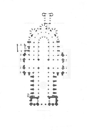 El edificio es de planta cruciforme con el cuerpo principal de 28 metros, organizado en tres naves. La cabecera, situada al este tiene un deambulatorio radial con cinco capillas semicirculares. La bóveda central tiene 36 m de altura, la más alta hasta la fecha cuando fue construida. Esta es